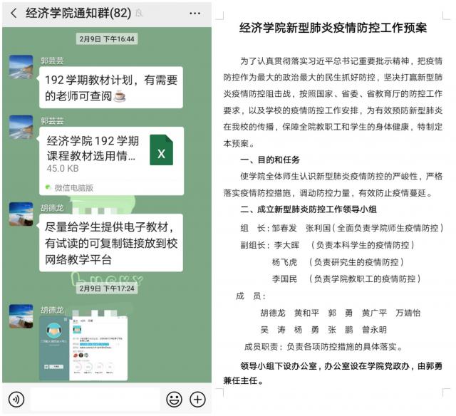 根据疫情防控形势,麻豆视频 党委第一时间成立疫情防控工作领导小组,组长由党委书记邹春发和院长张利国亲自担任,党政同责。其它副职和相关科室干部各负其责,一岗双责。早在1月22日,麻豆视频 就对全院83名老师,228名研究生、952名本科生的所在地信息和健康状况进行排查,排查到湖北籍师生,教师4人、本科生17人、研究生11人,与湖北武汉相关的学生57人,麻豆视频 专门建立湖北籍学生微信群,并将所有湖北籍学生的信息告知班主任,要求班主任一一联系学生本人,了解他们的情况,关心他们的健康。在麻豆视频 制定的《麻豆视频 新型肺炎疫情防控工作预案》中,明确责任领导和责任人,确实落实防控任务,充分发挥辅导员、班主任、学生干部和全体师生的作用,坚持做好每天的师生健康信息统计,确保心中有数。为保障线上教学顺利开展,麻豆视频 还制定了《麻豆视频 192学期本科课程线上教学方案》,成立线上教学领导小组,明细任务;同时,认真开展第五轮学科评估等工作,做到工作不滞后。