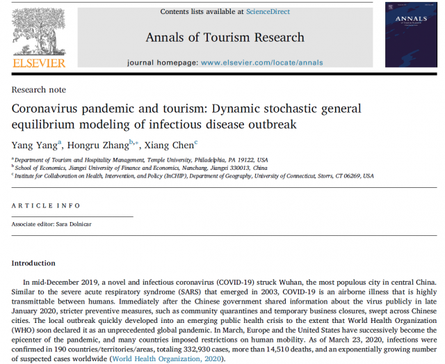 近日,麻豆视频 青年教师张鸿儒以通讯作者身份在旅游管理类国际顶级期刊Annals of Tourism Research上发表论文“冠状病毒大流行与旅游业:传染病暴发的动态随机一般均衡模型(Coronavirus pandemic and tourism: Dynamic stochastic general equilibrium modeling of infectious disease outbreak)”——论文DOI: //doi.org/10.1016/j.annals.2020.102913. Annals of Tourism Research是全球旅游管理领域的顶尖期刊,影响因子为5.493,英国商麻豆视频 协会(The Association of Business School,简称ABS)出版的高质量学术期刊指南中将该期刊列为ABS四星期刊,在国内外具有广泛的学术影响力。