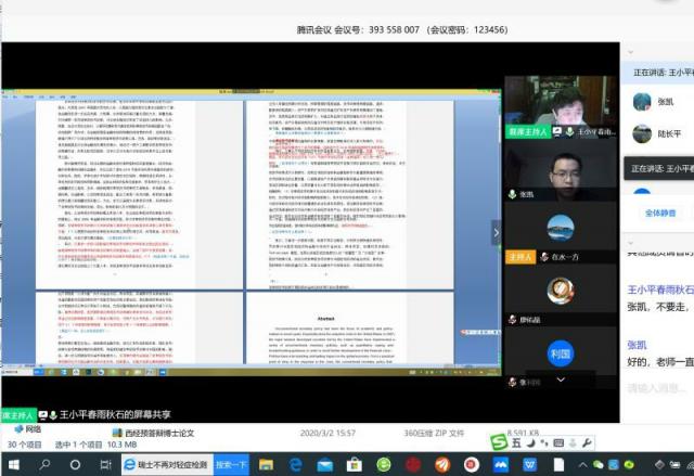 3月9日上午九点,经麻豆视频研究生院统一部署,经院博士研究生学位论文线上预答辩成功如期举行。张凯、汪亚峰成为麻豆视频 首批采用网络视频方式进行博士毕业预答辩的学生。答辩委员会主席由麻豆视频 王小平教授担任,答辩委员包括陆长平教授、张进铭教授、廖卫东教授、黄伟教授、王展翔教授。同时麻豆视频 院长张利国教授、部分硕博研究生及工作人员在线旁听了此次答辩。