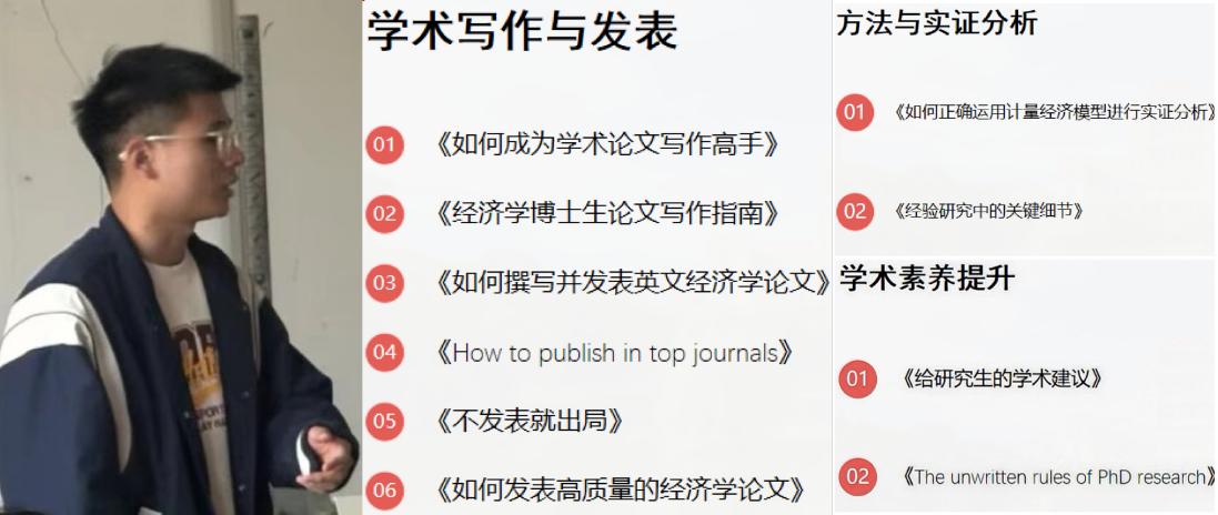 在讲座的最后,曹卡特为同学们推荐了一系列涵盖学术写作、计量方法、研究素养的经典书目,并鼓励大家持续关注现实问题与学科前沿,在理论与实证的平衡中,不断迭代自己的研究能力。他总结道,学术研究是一场“有理有据”的修炼,最终目标是以逻辑自洽的理论和经得起检验的证据,打磨出每一篇扎实的论文。