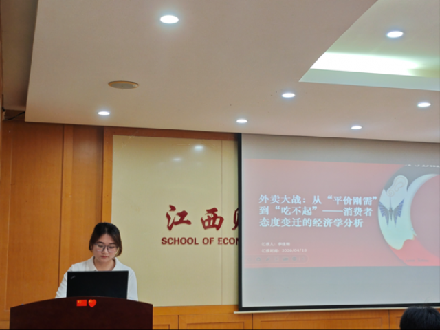 活动中,各队伍依次进行PPT路演陈述,围绕吖嘀吖嘀量贩零食、蜜雪冰城、蔚来汽车、华为芯片破局、泡泡玛特盲盒经济、外卖行业发展等热点案例展开深度剖析。选手们运用经济学理论与规范研究方法,从商业模式、市场竞争、发展瓶颈、破局路径、消费者行为等维度展开严谨分析,逻辑清晰、论据充分、视角新颖,充分展现了扎实的专业功底与良好的学术表达能力。